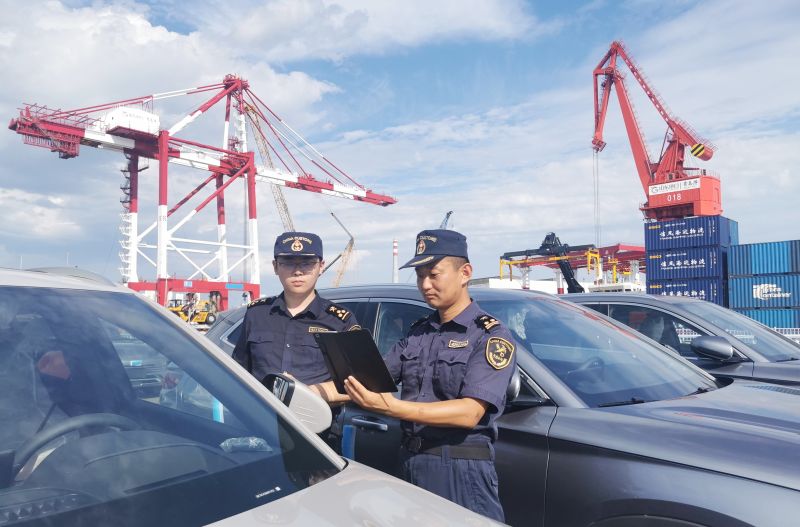 圖為:海關(guān)關(guān)員監(jiān)管新能源汽車出口 李健/攝