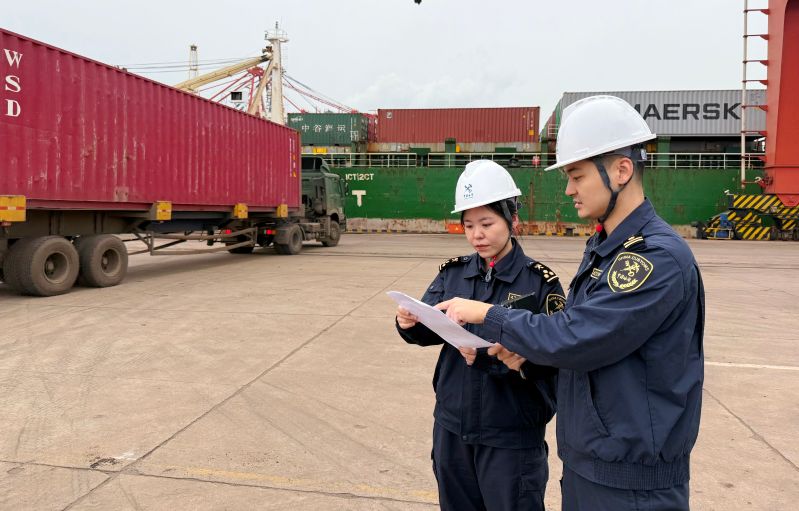 圖為:海關(guān)關(guān)員對(duì)內(nèi)支線貨物進(jìn)行現(xiàn)場(chǎng)監(jiān)管 李想/攝