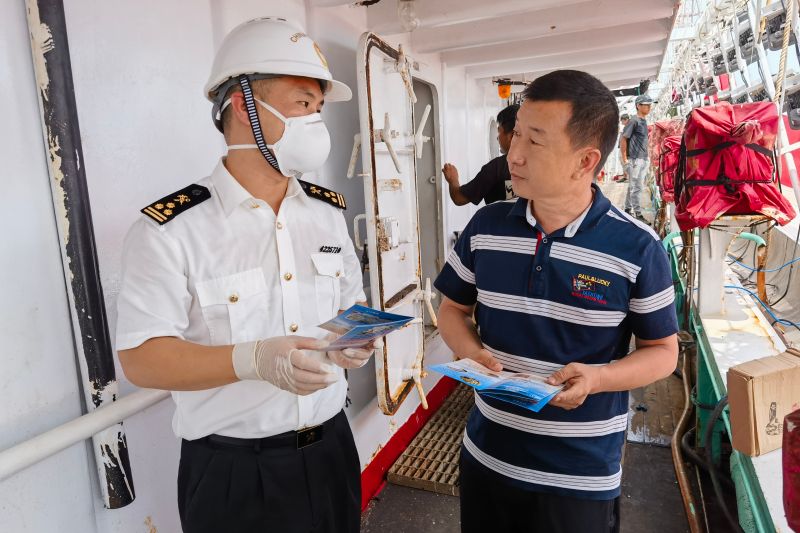 圖為:海關(guān)關(guān)員到遠(yuǎn)洋漁船開展禁毒宣傳 馮飛/攝