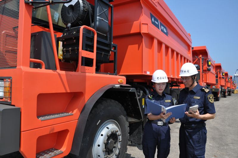 圖為:海關(guān)關(guān)員現(xiàn)場監(jiān)管查驗(yàn)出口幾內(nèi)亞工程車輛 蔡子揚(yáng)/攝