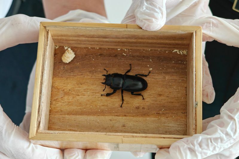 海關(guān)關(guān)員在對(duì)進(jìn)境旅客行李物品進(jìn)行監(jiān)管時(shí),發(fā)現(xiàn)一名旅客的隨身背包機(jī)檢圖像異常,遂進(jìn)行開包查驗(yàn),在其攜帶的首飾盒內(nèi)查獲活體甲蟲1只,體長(zhǎng)約4厘米,盒內(nèi)裝有少量木屑。經(jīng)實(shí)驗(yàn)室鑒定,該活體甲蟲為泰坦扁鍬甲,雌性。