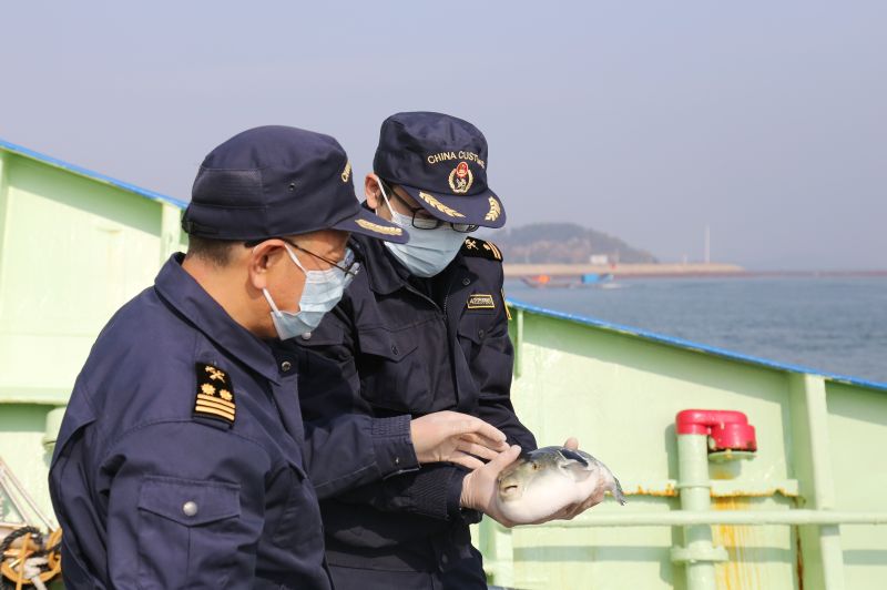 圖為:海關(guān)關(guān)員在運(yùn)輸船上監(jiān)管出口河鲀 王輝/攝