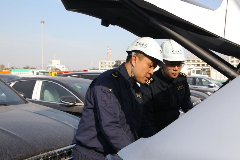 圖為:海關(guān)關(guān)員現(xiàn)場(chǎng)監(jiān)管出口新能源車 李琳/攝