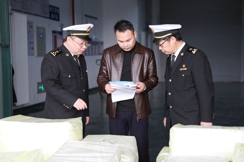 圖為:海關關員正在與企業(yè)核對人發(fā)原材料信息 顧曉晴/攝