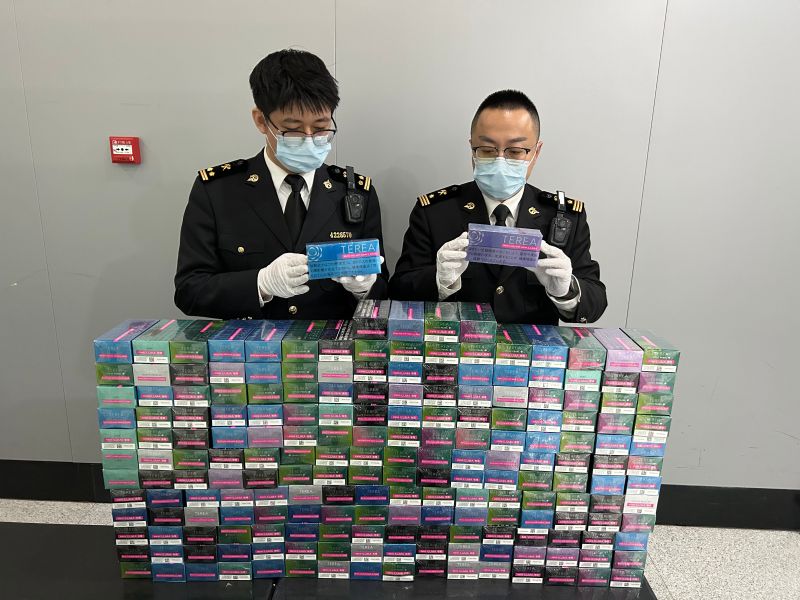 圖為:海關(guān)關(guān)員查獲的煙草制品 董雪強(qiáng)/攝