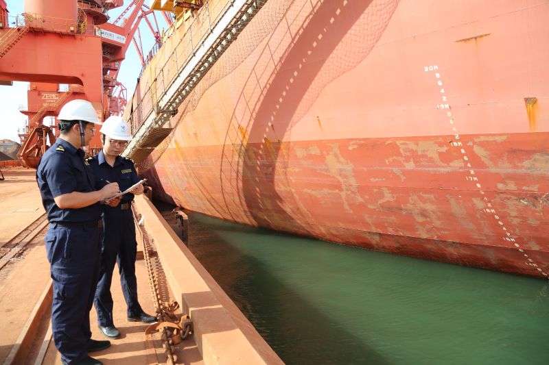 圖為:海關(guān)關(guān)員對進(jìn)口鐵礦砂實(shí)施水尺計重 賈婷/攝