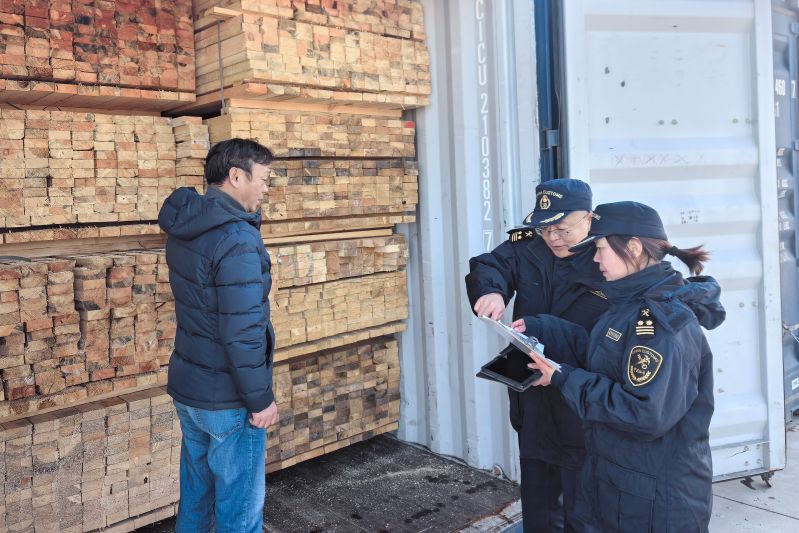 圖為:海關(guān)關(guān)員對(duì)進(jìn)口木材進(jìn)行現(xiàn)場(chǎng)監(jiān)管 賈永琦/攝