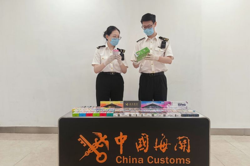圖為:海關關員查獲違規(guī)攜帶進境卷煙、電子煙及電子煙具 高峰/攝