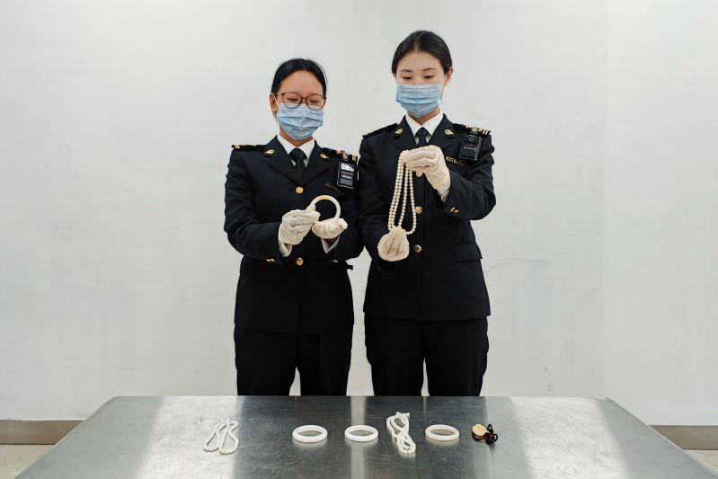 海關(guān)關(guān)員在對入境航班進(jìn)行行李物品監(jiān)管時,發(fā)現(xiàn)3名旅客行李CT機圖像顯示異常。經(jīng)開箱查驗,發(fā)現(xiàn)行李中有手鐲、項鏈等疑似硨磲飾品8件,共計574.34g。經(jīng)鑒定,查獲的飾品均為雙殼綱簾蛤目硨磲科物種制品。