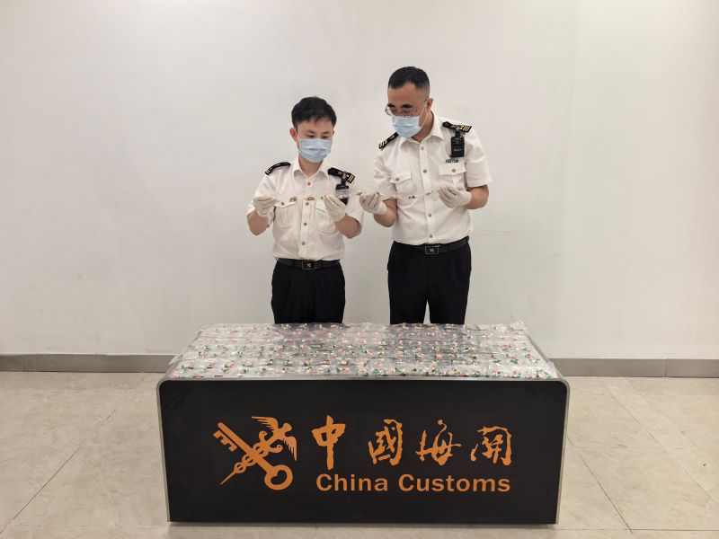 海關(guān)關(guān)員在對入境航班進(jìn)行監(jiān)管時,發(fā)現(xiàn)一名旅客手提行李過機圖像異常,遂進(jìn)行開包查驗,在其行李內(nèi)發(fā)現(xiàn)“三無”減肥產(chǎn)品2310粒。經(jīng)檢測呈甲基安非他明和可卡因陽性。