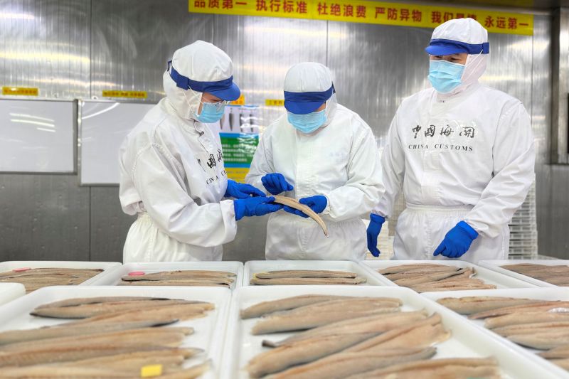 圖為:海關(guān)關(guān)員對(duì)出口鮐魚(yú)片進(jìn)行現(xiàn)場(chǎng)查驗(yàn) 陳莉/攝